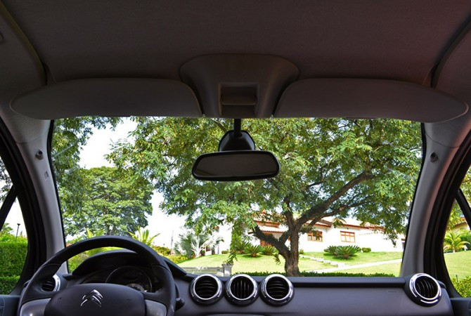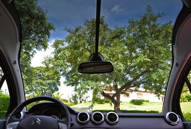 1) Para-brisa panorâmico: Certamente, o ponto de destaque do Citroën C3 é o exclusivo para-brisa Zenith. Inspirado no conceito Space Vision do C4 Picasso, o para-brisa avança sobre uma parte do teto. Isso resultou numa expansão do comprimento do para-brisa de 99 cm para 1,35 m, o que possibilitou aumentar do ângulo de visão superior em até 80 graus. Como uma bolha de vidro, o para-brisa Zenith permite ao moto rista e ao passageiro uma percepção ampla do meio ambiente, graças a uma visão vertical única nessa categoria de veículo. Essa visão pode ser mudada, com o simples “puxar” de uma cobertura. Construída com plásticos rígidos, essa proteção na posição estendida deixa a visão frontal igual a de um para-brisa normal. A proteção pode ser deixada em qualquer ponto do seu trilho, permitindo uma escolha livre entre a visão normal ou ângulo máximo vertical. O C3 é o único modelo de toda a categoria com esse recurso.