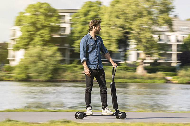 Embora o piloto mantenha uma mão sobre o guidão, ele controla o patinete como um skate, com os pés mudando seu peso. Os eixos móveis com quatro rodas permitem curvas muito apertadas.