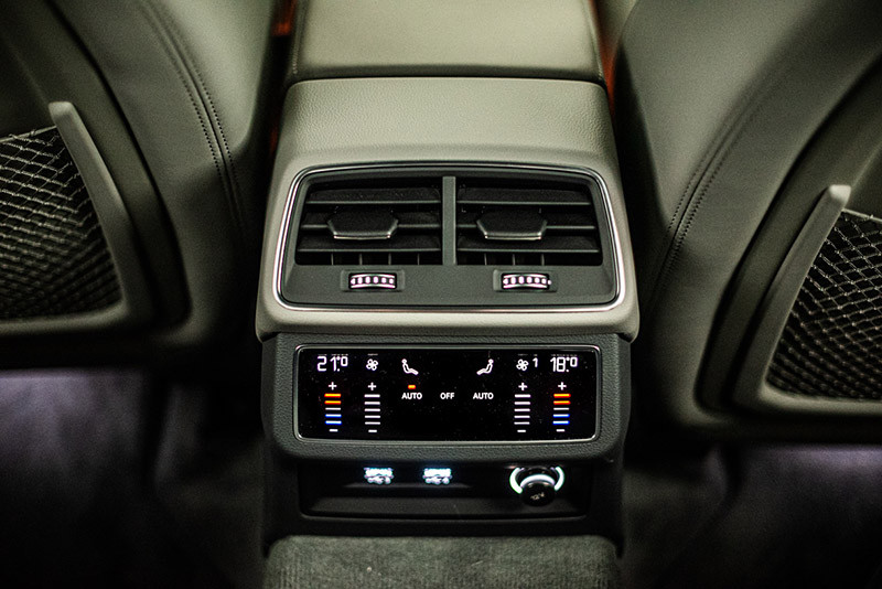 Na tela superior de 10,1” o display traz o MMI que exibe diversas informações, como interface com smartphones com Android e iOS, informações de navegação, seleção de rádio e o Audi Drive Select com 5 funções de direção: Comfort, Dynamic, Efficiency, Indivudal e Auto. O display inferior de 8,6”, montado no console do túnel central, fornece acesso ao controle de climatização, funções de conforto e entrada de texto. Para manuseá-lo, o motorista pode repousar o punho sobre a alavanca seletora da transmissão automática.