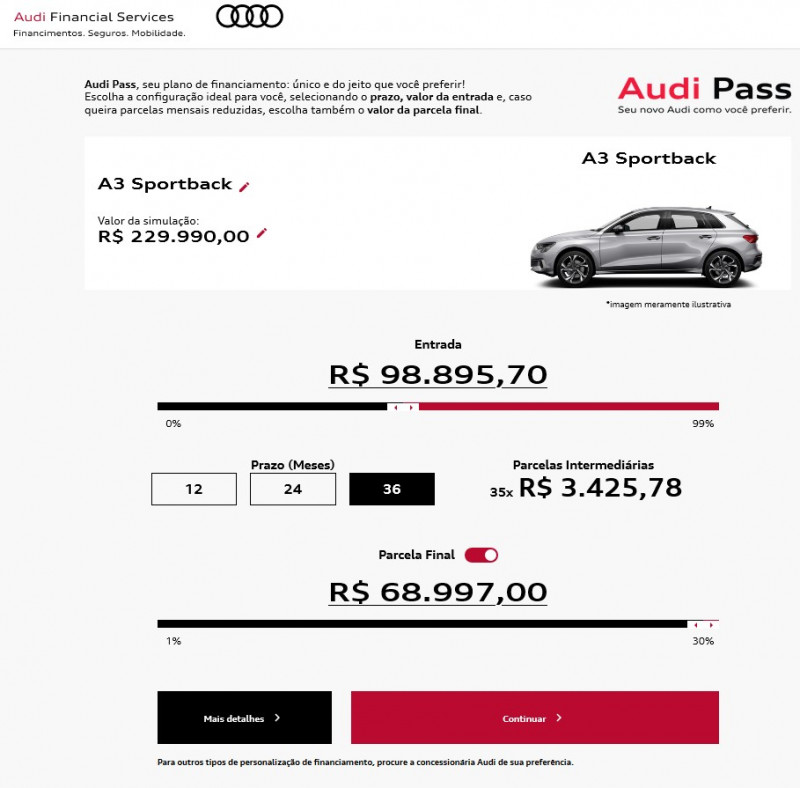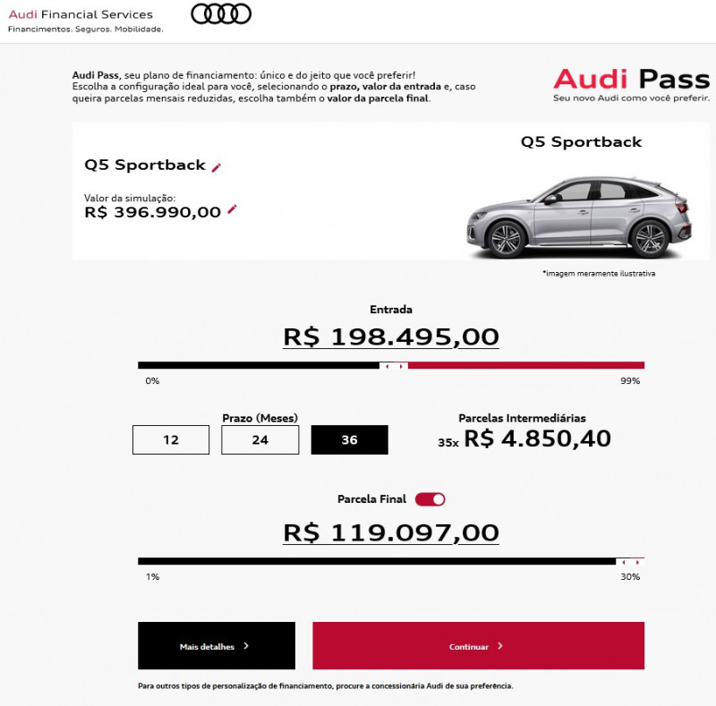 A simulação de um plano de financiamento no Audi Pass é muito simples. O primeiro passo é escolher o modelo desejado para conhecer seu valor de venda. A partir deste ponto começa toda a personalização. A primeira escolha é o período de carência da primeira parcela de até 90 dias. Na sequência, o cliente seleciona o valor da entrada, parcela final (balão) e número de parcelas mensais.