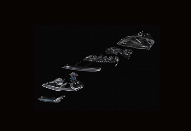 O projetor de laser é a mais recente tecnologia de produção de uma longa linhagem de inovações em iluminação. Cada farol contém um módulo laser que opera com quatro diodos laser de alta intensidade com fachos azulados. Esses fachos são concentrados num prisma. Cada facho tem apenas 300 milésimos de milímetro de diâmetro. O prisma reúne os quatro raios laser de alta intensidade gerando um facho azul de comprimento de onda de 450 nanômetros. Então, um conversor de fósforo transforma essa luz azul super potente, em luz branca pura com temperatura de 5.500 Kelvin. Essa luz é mais segura para os olhos. Então essa luz é projetada num refletor que direciona ela para a pista, depois de passar numa lente “guia”