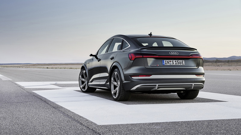A grande bateria de alta tensão – que permite uma autonomia de até 380 km no ciclo WLTP – garante uma distribuição equilibrada do peso e é instalada em uma posição baixa comparável à dos três motores elétricos. Isso diminui o centro de gravidade do carro, o que oferece grandes vantagens em termos de condução dinâmica. A direção progressiva, cuja relação se torna cada vez mais direta à medida que o movimento da direção aumenta, enfatiza o caráter esportivo. A suspensão a ar adaptativa tem afinação esportiva e o sistema Audi drive select oferece sete modos de condução – dependendo do modo selecionado ele acessa a suspensão com amortecimento regulado e pode variar a altura do solo em até 76 milímetros.
