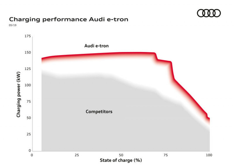 A curva de carga de 150 kW do Audi e-tron é caracterizada pela continuidade em alto nível. Em condições ideais, o veículo carrega de 5% a 70% no limite da potência máxima antes que a gestão inteligente da bateria baixe os níveis da corrente para proteger as células de íons de lítio e garantir a vida útil. É uma grande diferença dos outros conceitos, que normalmente só atingem sua potência total por pouco tempo (pico) e reduzem consideravelmente a potência antes de atingir o limite de 70%. Isto porque o Audi e-tron continua a carregar acima de 100 kW quando atingir 80%.