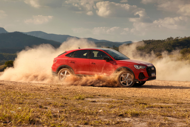 O Audi Q3 Sportback oferece diversão ao volante em diferentes tipos de terrenos graças à direção progressiva, suspensão esportiva e tração nas quatro rodas. A suspensão transmite agilidade e conforto nos trechos urbanos e estradas sinuosas devido aos ajustes precisos das molas e amortecedores para o mercado brasileiro, com o aumento de 18,5mm na altura da suspensão dianteira e 13,5mm na suspensão traseira. É possível selecionar diferentes modos dinâmicos personalizando ainda mais a experiência do motorista ao volante.