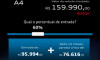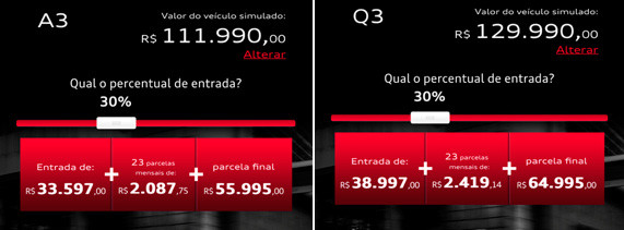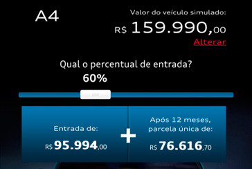 Audi One Time: simplificado e sem parcelas mensais, o produto possui entrada a partir de 50% do valor do bem e apenas uma prestação, que deve ser quitada após 12 meses da aquisição. Caso o cliente queira trocar de carro, poderá utilizar o próprio veículo para quitar a parcela e adquirir um novo modelo Audi. Exemplo: