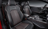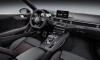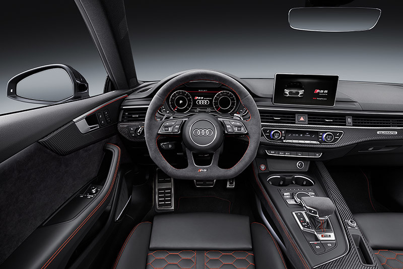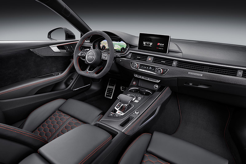 O interior traz muitos equipamentos esportivos. Os bancos RS e o volante esportivo multifuncional com base aplanada de couro também destacam as características de alta performance do cupê em seu interior. O volante traz o emblema RS, assim como os encostos dos bancos dianteiros e a base da alavanca do câmbio. Telas especiais RS no Audi virtual cockpit fornecem informações sobre a pressão dos pneus, o torque e a força G. Uma luz alerta o motorista a hora de trocar as marchas quando o limite de rotações é atingido. O volante, a alavanca de câmbio e as o acabamento interno são revestidos com couro Alcântara.