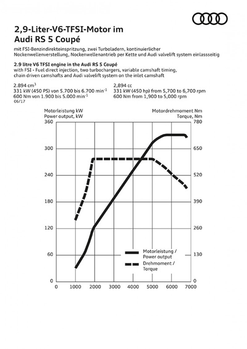 O motor 2.9 TFSI V6 biturbo oferece significativo aumento de potência e eficiência, além de som mais grave. O propulsor desenvolve 450 cv e seu torque máximo de 600 Nm (170 Nm a mais que o modelo anterior) está disponível em uma faixa de giros de 1.900 rpm a 5.000 rpm. O modelo top de linha da família A5 acelera de 0 a 100 km/h em 3,9 segundos e atinge uma velocidade máxima de ou 280 km/h.