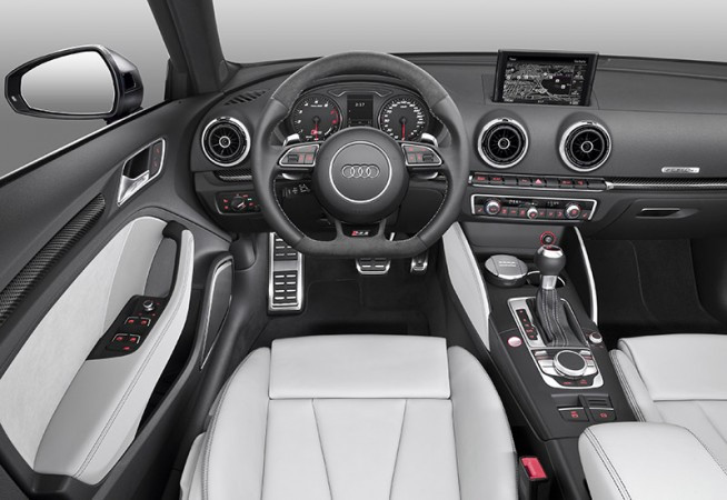 O equipamento de série do novo Audi RS 3 Sportback também inclui o sistema de estacionamento parking plus e o rádio MMI. As opções englobam os bancos esportivos S com padronagem diamante, logos estampados e forração clara opcional, além de, pela primeira vez no segmento dos compactos, os novos bancos RS tipo concha com airbags laterais integrados e estrutura em carbono, sete quilos mais leve do que o assento esportivo básico. Outra opção é o pacote de design interior RS 3 com detalhes vermelhos na almofada de joelho, entradas de ar, tapetes e cintos de segurança. A mesma cor também é visível através das perfurações dos bancos esportivos S.