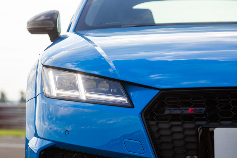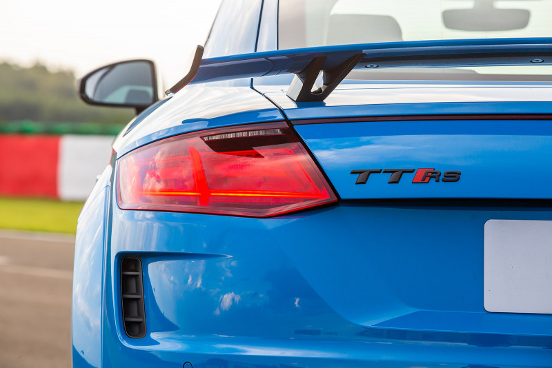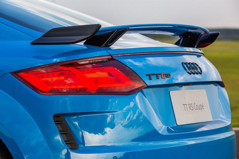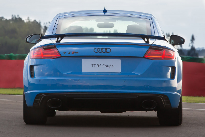 Na traseira, a nova asa fixa chama a atenção com os novos winglets nas duas pontas. Como parte do conceito de aerodinâmica, ele oferece suporte ao desempenho e à eficiência dos modelos esportivos. As duas grandes saídas de escape ovais também se destacam no design do novo TT RS. Os faróis Full LED Matrix são de série no modelo. Esse equipamento permite uma gestão totalmente automática do facho do farol. Ele tem a capacidade de “recortar” o carro que vai à frente à noite, mantendo o máximo de iluminação em regiões escuras da via ou estrada.