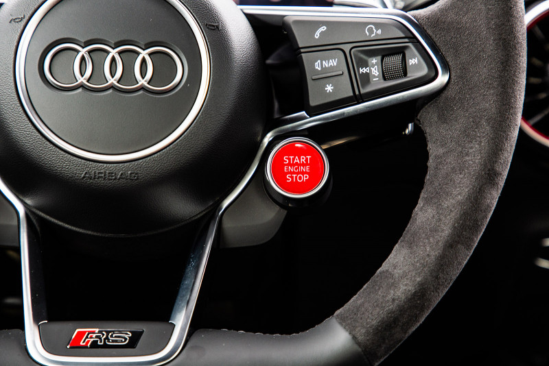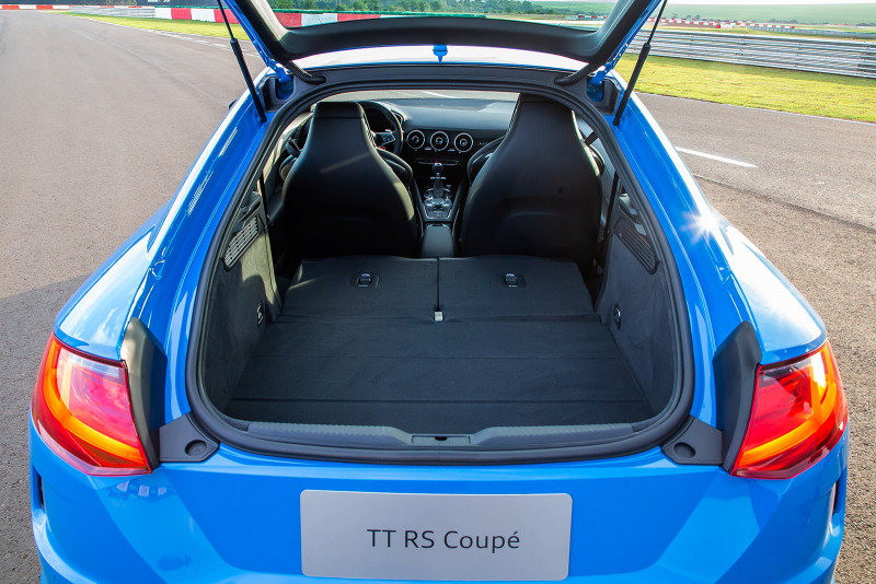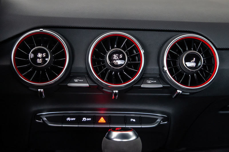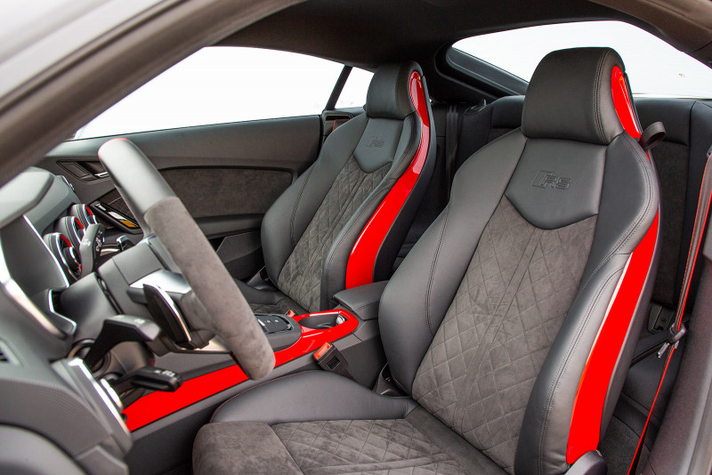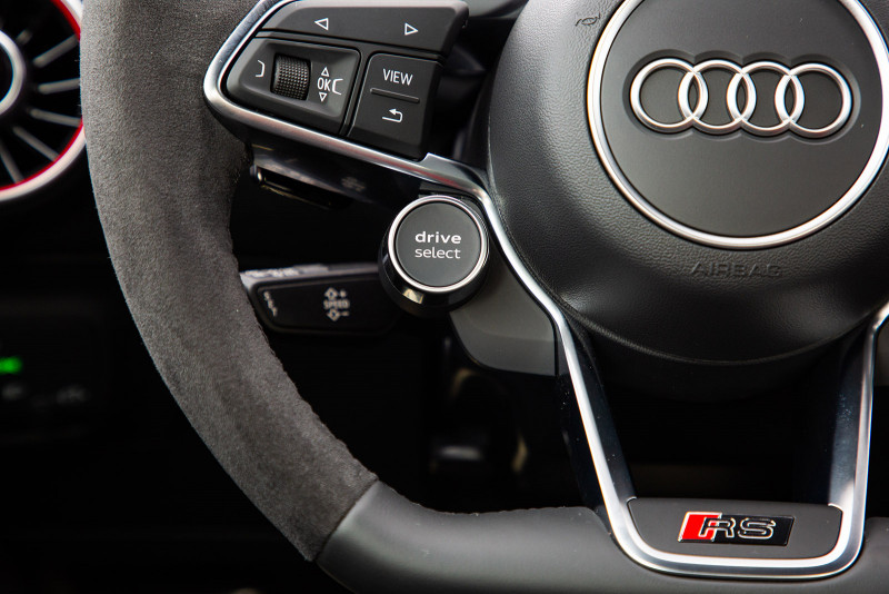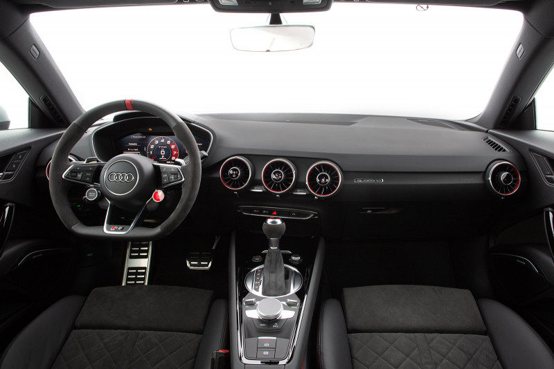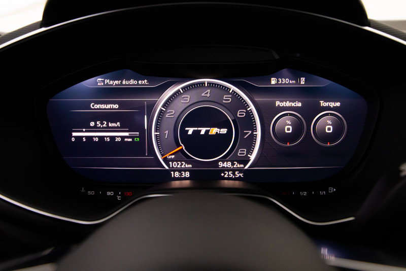 Os controles e a exibição do novo TT RS são totalmente focados no motorista. Os bancos esportivos RS em Alcântara, bem como os logotipos RS nos bancos, volante, frisos das soleiras das portas e alavancas seletoras, realçam o carácter desportivo do Coupé. Os visores RS especiais no Audi virtual cockpit, com uma tela de 12,3 polegadas, fornecem informações sobre torque e força G. Além dos botões multifuncionais, o volante esportivo RS em couro possui controles para ligar e desligar o motor, bem como selecionar o modo de direção no Audi drive select.
