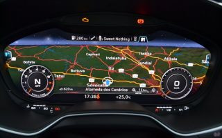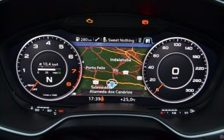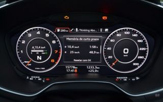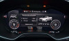 Aposentando de vez os ponteiros no painel, a Audi Virtual Cockpit é na verdade uma grande tela de alta resolução. Assim, ao toque de botões no volante, o moto rista pode optar entre dois modos de exibição: na versão clássica, o velocímetro e o conta-giros ficam maiores nos cantos com uma pequena exibição gráfica ao centro.