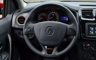 Já no interior as diferenças são os novos bancos, mais confortáveis e anatômicos, com detalhes de estilo nas costuras. A cor laranja no acabamento interno confere um toque sutil e especial, com destaque para as saídas de ar laterais e o painel de instrumentos, que também tem contornos com preto brilhante. Outro detalhe na cor laranja e que chama a atenção é a inscrição “Stepway” no raio inferior do volante. O painel central todo em preto brilhante também contribui para o visual sofisticado do modelo. Assim como os novos Logan e Sandero, o design da nova versão Stepway foi desenvolvido com a participação do Renault Design América Latina (RDAL).