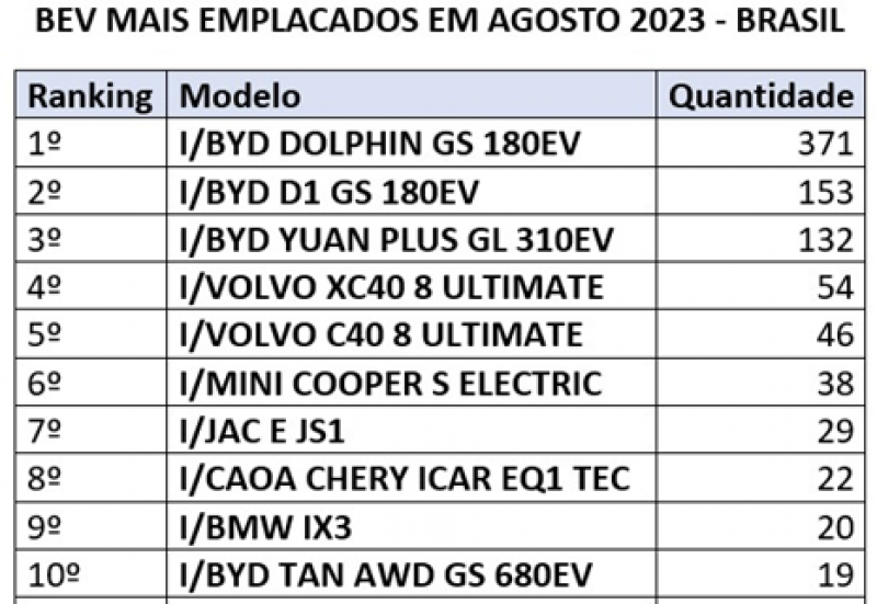 A BYD também dominou o pódio entre todos os modelos elétricos emplacados, ocupando as três primeiras colocações no ranking.