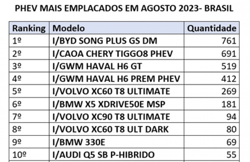 No total geral, a BYD foi a terceira montadora que mais emplacou veículos elétricos e híbridos. Segundo dados da ABVE, agosto bateu o novo recorde mensal de vendas de veículos leves eletrificados no Brasil, com 9.351 emplacamentos - 25% acima do recorde anterior de julho (7.462) e 120% sobre agosto de 2022 (4.249).