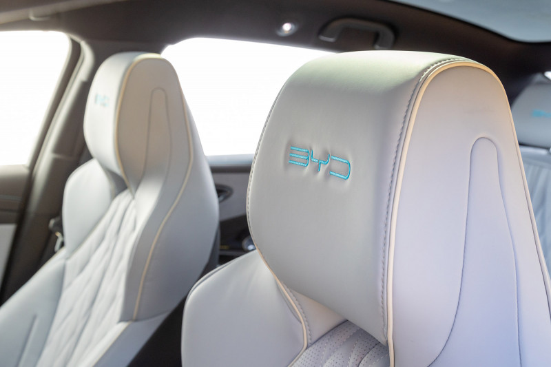 Os bancos dianteiros do Seal têm uma aparência esportiva com estofamento macio e firme e revestimento de alta qualidade. O banco do motorista é eletricamente ajustável em oito posições e conta com apoio lombar também ajustável em quatro direções para aliviar a fadiga de viagens longas.