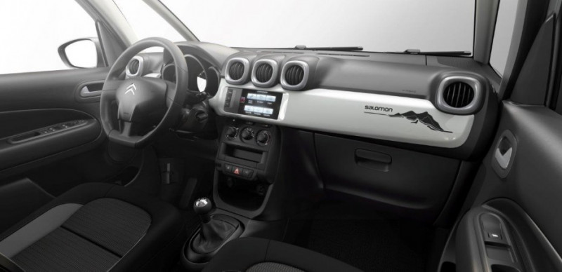 No interior, o grafismo Salomon é aplicado no painel de bordo, próximo à saída de ar do lado direito. Nas unidades em Blanc Nacré, a moldura do painel também será branca.