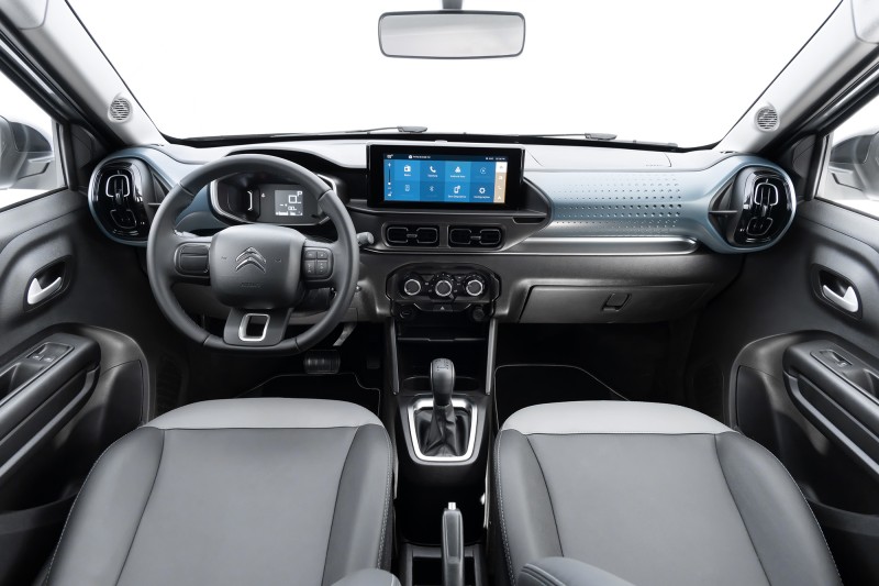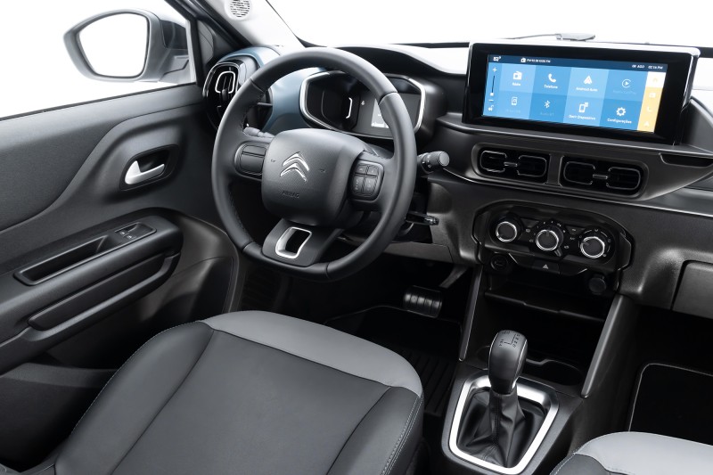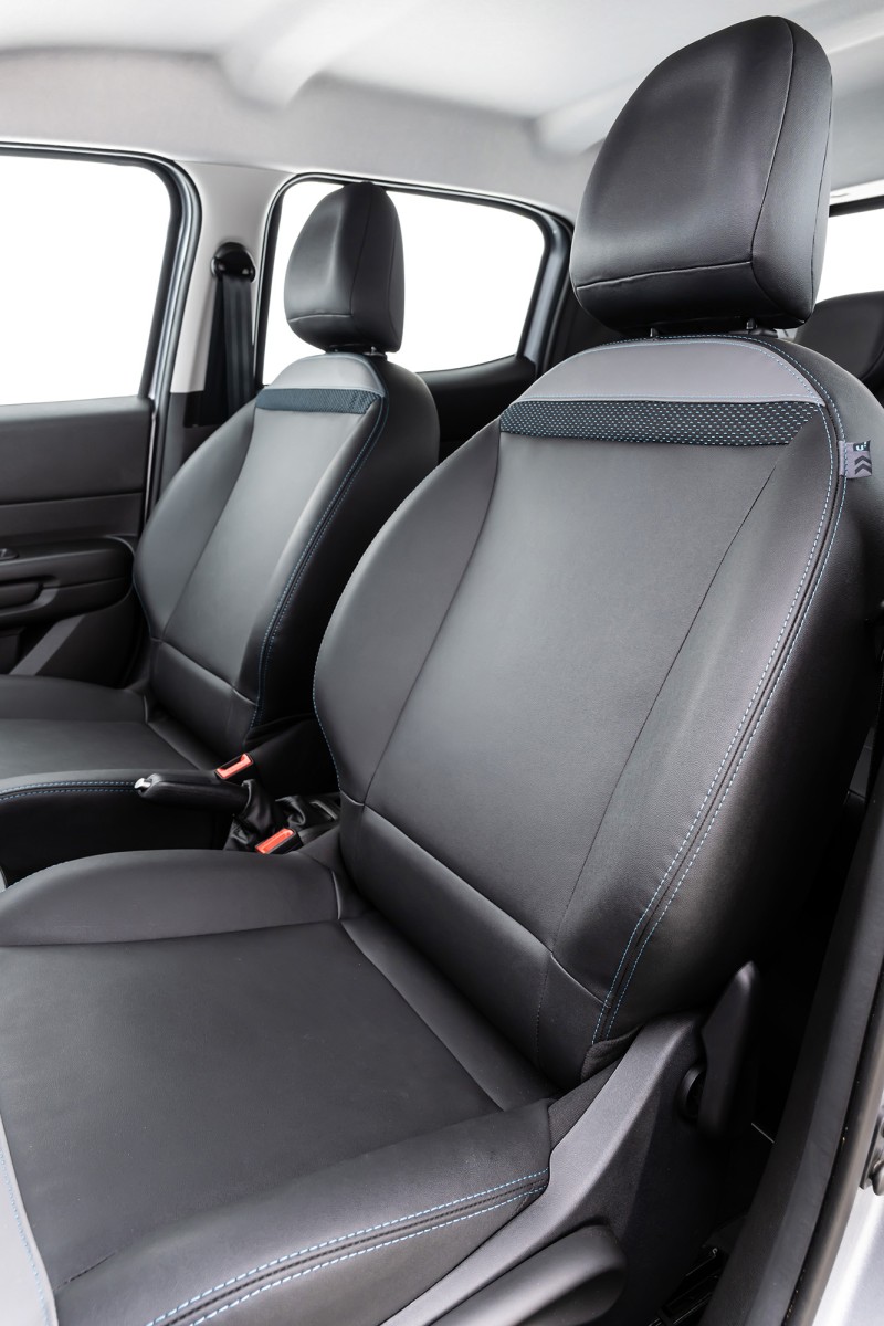 O interior acompanha as mudanças, com destaque para os bancos dotados de uma exclusiva forração premium. O material recebe costuras também em tom azul, cor que se repete nas bordas dos tapetes com o nome da versão. Por fim, soleiras metalizadas completam o pacote de estilo que diferenciam o Novo C3 YOU!.