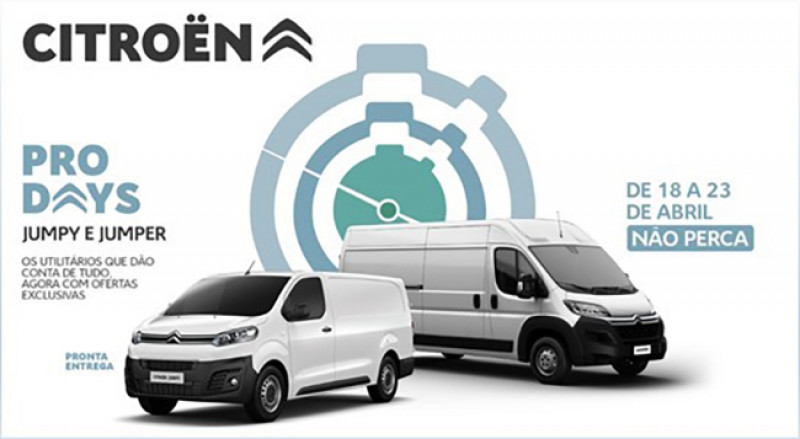 Começa hoje o PRO DAYS Citroën, uma grande iniciativa de vendas que apresenta ofertas imperdíveis para a linha de veículos utilitários da marca. Entre os dias 18 e 23 de abril a ação acontece na Citroën Notre Dame (www.citroennotredame.com.br), em Sorocaba. Uma semana inteira com descontos exclusivos para todos os frotistas e profissionais autônomos que buscam uma excelente oportunidade de negócios.