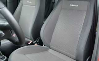 Já no Gol Rallye a Volkswagen foi muito conservadora no interior. São pouquíssimas as mudanças em relação a versão tradicional. Uma delas é o teto forrado em cor preta. Aliás, é o preto que dá o tom no carro. Outra diferença são os bancos forrados com tecidos que utilizam fios de PET reciclado. A faixa central é destacada, com detalhes em baixo relevo e o logotipo Rallye bordado. De resto, não existem diferenças expressivas. Conta a favor do carro da Volkswagen um acabamento com melhor qualidade estrutural, com encaixes mais bem feitos e menor quantidade de ruído sob vibrações. Mas a Volkswagen deixou a desejar no visual, considerando a proposta esportiva do modelo.