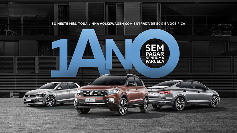 Numa ação inédita, a Volkswagen lança a campanha “1 ano inteiro sem pagar nenhuma parcela”. No mês de junho, o cliente compra qualquer modelo da linha Volkswagen pagando só 50% do valor e o restante só será pago depois de um ano.