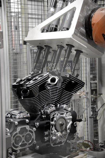 No extremo norte da unidade, uma esteira rolante alimenta as carcaças dos cabeçotes Twin Cam fundidas em um centro de usinagem de cinco eixos, que usina todas as superfícies planas, a câmara de combustão, assentamentos de válvulas; fura e faz a rosca do orifício da vela de ignição; e, em seguida, limpa todos os cavacos de alumínio em uma única operação. Em outro centro de usinagem, um robô gigante é responsável pela união das metades direita e esquerda das carcaças, levantando cada parte sobre um jato de ar para afastar os detritos antes de juntá-los com parafusos e fios, usinando as cavidades dos rolamentos do virabrequim, garantindo alinhamento absoluto das superfícies. As metades da carcaça são carimbadas com um número de motor e continuarão a ser um conjunto quando separados para a montagem final.