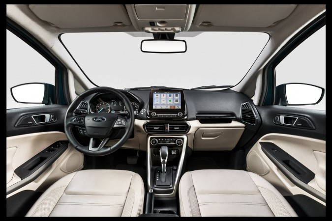 O interior do EcoSport 2.0 Titanium traz materiais totalmente novos, incluindo painel com toque macio (“soft touch”). Os bancos redesenhados são de couro tratado com repelente de sujeira. O volante é multifuncional, também em couro.