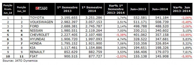 A Toyota lidera a 1ª colocação no fechamento do primeiro semestre de 2014 com alta 1,74% em relação ao mesmo período de 2013. Logo em seguida está a Volkswagen com crescimento de 2,51%.