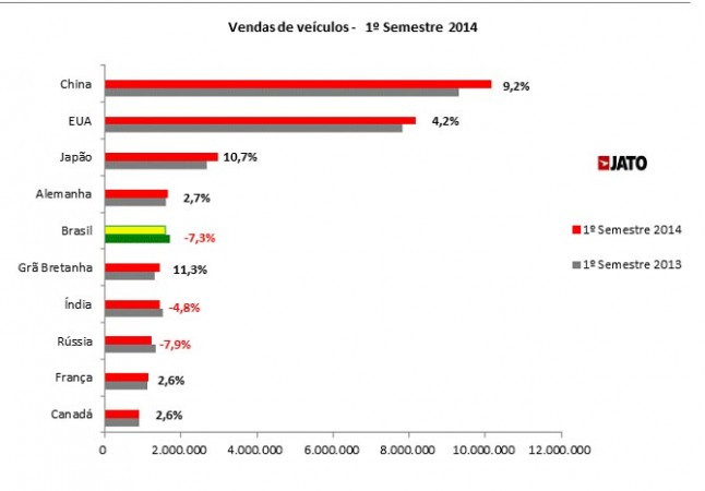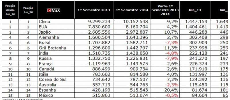 A JATO Dynamics do Brasil divulga seu release mensal com os dados de veículos vendidos mundialmente no primeiro semestre de 2014. A China mantém a liderança atingindo mais de 10 milhões de veículos vendidos de janeiro a junho de 2014, encerrando o primeiro semestre com crescimento de 18,4% se comparado ao mesmo período de 2013. Os EUA seguem em 2º lugar apresentando alta nas vendas de 4,2%. O Japão mantém a 3ª colocação demonstrando recuperação no setor e com alta de 10,7% no acumulado até junho em relação ao ano anterior. Os dados chineses incluem apenas veículos de passeio. Para o restante dos países os números englobam carros e comerciais leves.