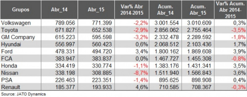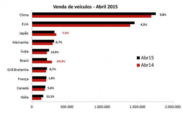 A JATO Dynamics do Brasil, divulga seu release mensal com os dados de veículos vendidos mundialmente até abril de 2015. A China mantém a liderança apresentando crescimento de 3,8% em abril de 2015 se comparado ao mesmo período de 2014. Os EUA ocuparam o 2º lugar com alta nas vendas de 4,5% ante abril do ano anterior. O Japão, na terceira colocação, apresentou uma significativa queda de 7,9% no mês de abril e 13,5% no acumulado do ano em relação ao ano anterior. Os dados chineses incluem apenas veículos de passeio. Para o restante dos países os números englobam carros e comerciais leves.