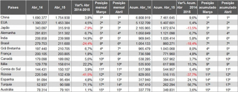 A Alemanha subiu um posto e agora é o quarto maior mercado no ranking mensal e no acumulado, apresentando 6,7% de alta nas vendas para ambos os períodos, coincidentemente. A Índia segue logo atrás na 5ª colocação à frente do Brasil, que subiu duas posições em relação ao mês anterior ocupando a 6ª posição mas com queda expressiva de 24,4% em abril se comparado ao mesmo período de 2014.