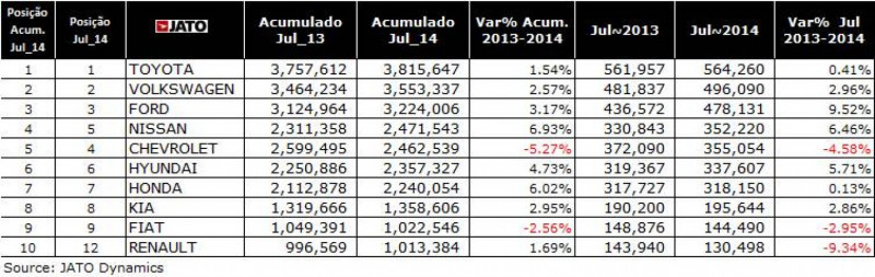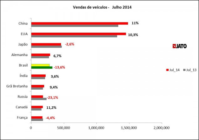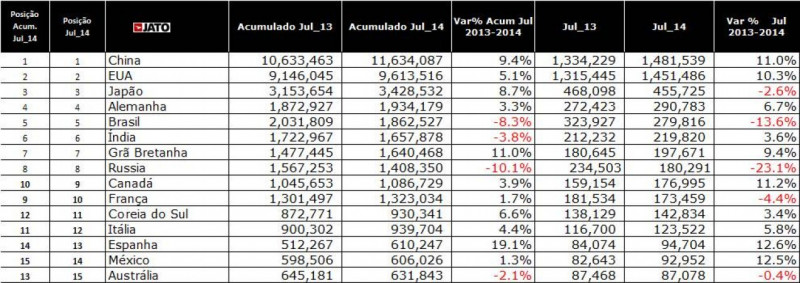 A Jato Dynamics do Brasil divulga seu release mensal com os dados de veículos vendidos mundialmente em julho de 2014. A China mantém a liderança ultrapassando a marca de 11 milhões de veículos vendidos de janeiro a julho de 2014, representando um crescimento de 9,4% no acumulado e 11% em julho se comparado ao mesmo período de 2013. Os EUA seguem em 2º lugar apresentando alta nas vendas de 10,3%. O Japão mantém a 3ª colocação com baixa de 2,6% no mês de referência. (Os dados chineses incluem apenas veículos de passeio. Para o restante dos países os números englobam carros e comerciais leves.)