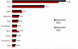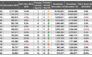 O mercado brasileiro ainda sofre retração significativa e, não diferente do restante do ano de 2015, mostra variações negativas de 32,3% no mensal e 24,2% no acumulado. Diante da recessão econômica que afeta todos os setores do País, o Brasil perde espaço mundial frequentemente e agora ocupa a 7ª colocação em ambas apurações.