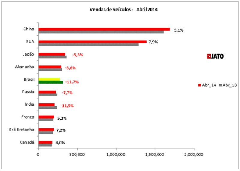 A JATO Dynamics do Brasil divulgou seus dados mensais com os veículos vendidos mundialmente, em abril de 2014. A China mantém a liderança com crescimento de 5,1% quando comparado ao mesmo período de 2013. Os EUA seguem em 2º lugar apresentando alta nas vendas de 7,9% e com mais de 1,3 milhão de veículos vendidos apenas no quarto mês do ano. O Japão mantém a 3ª colocação com queda nas vendas de 5,3% mas expressivo crescimento no acumulado de janeiro a abril de 15,5% em relação ao ano anterior. Os dados chineses incluem apenas veículos de passeio. Para o restante dos países os números englobam carros e comerciais leves.