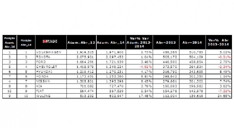 A Volkswagen subiu para a 1ª colocação em abril com alta 5,02% em relação ao mesmo período de 2013, entretanto se forem consideradas as vendas no acumulado dos quatro primeiros meses, a Toyota mantém a liderança no ranking entre os mais vendidos.