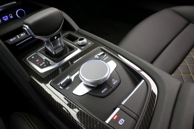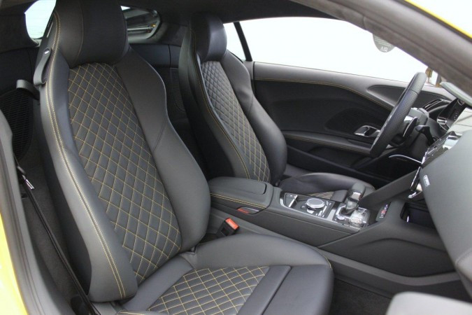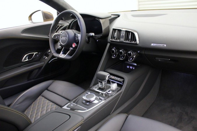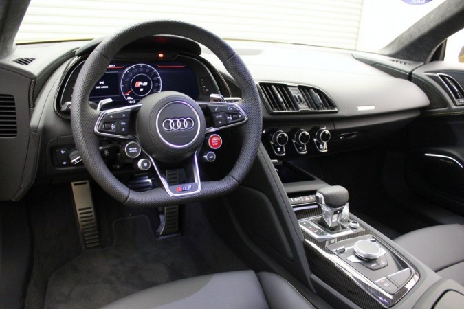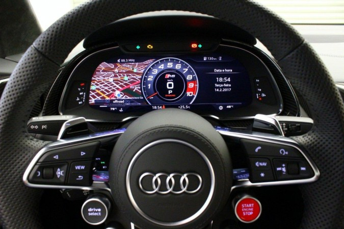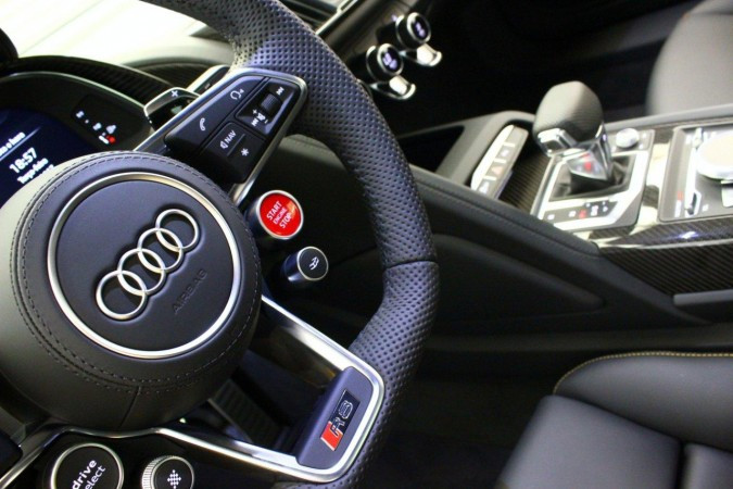 O famoso motor aspirado V10 traseiro-central é acionado por meio de um botão de controle satélite, e o motorista usa um segundo botão para ajustar suas preferências no Audi drive select, o Sistema de condução dinâmico. Dois botões adicionais, e um rotatório, são usados para controlar as abas do escapamento e o modo performance, que inclui mais três programas de direção: seco, molhado e neve, que adaptam a dirigibilidade de forma mais precisa às respectivas condições da estrada.