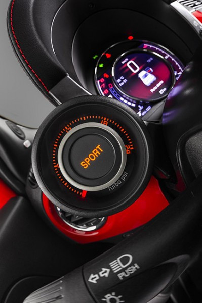 Para ampliar ainda mais a sensação de “piloto”, a tecla Sport é mais uma garantia de diversão. O quadro de instrumento assume novas funções, dando mais esportividade ao modelo. O contagiros ganha destaque e no canto direito surge uma tela que indica a posição do pedal do acelerador, como nos verdadeiros carros de corrida. Além dessas mudanças no painel, a função “Sport” aumenta automaticamente a pressão do turbocompressor na faixa de torque do moto r, de 0,8 bar para 1,24 bar, o volante ganha “peso” e o pedal do acelerador responde ainda mais rapidamente. Com modo Sport acionado, todos os parâmetros dinâmicos do veículo são levados a um degrau superior e o Fiat 500 se torna mais Abarth do que nunca.