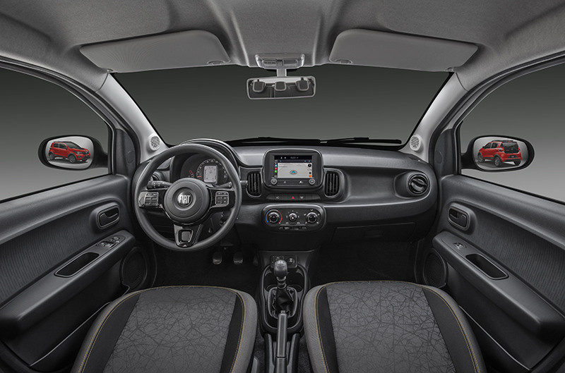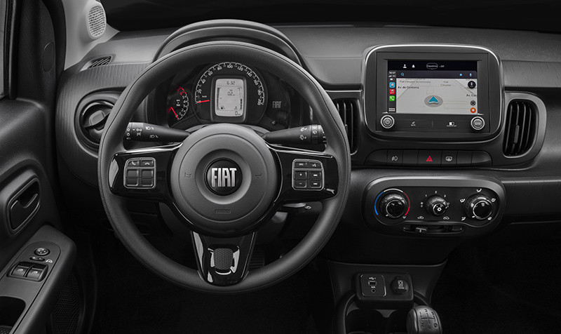 O Mobi 2021 levou também para seu interior a nova identidade da marca. O Logo Script está no centro do volante e na chave. Já a Fiat Flag está presente no revestimento do câmbio, deixando clara a italianidade da marca.