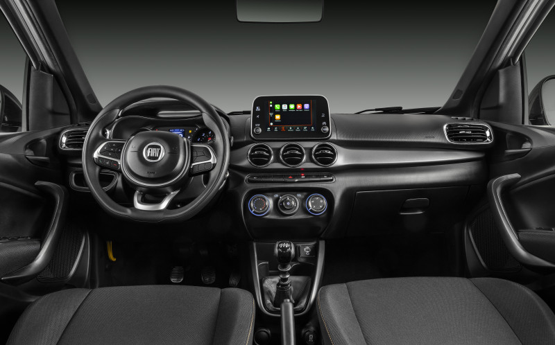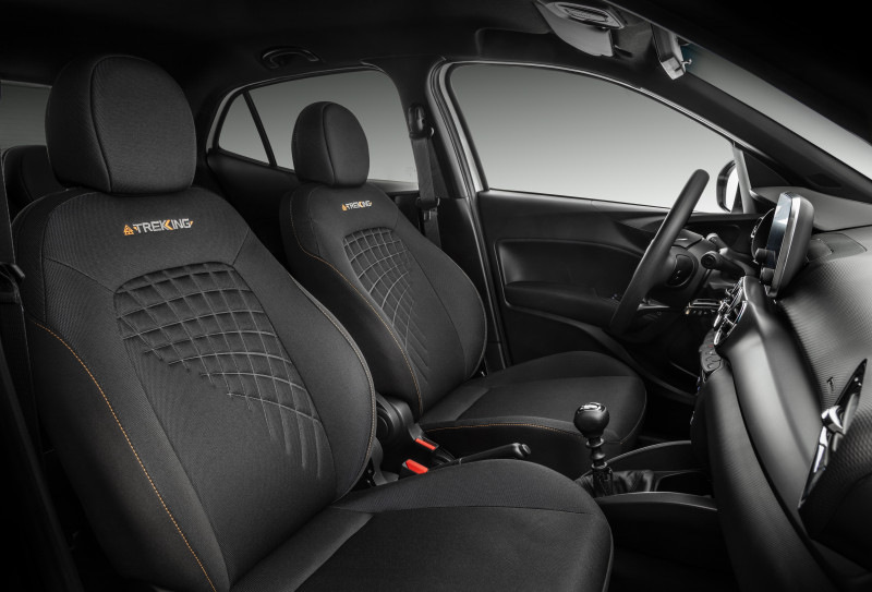 Por dentro, a versão traz tecido escuro dos bancos com o contraste da costura laranja, área central com textura quadriculada e o logotipo Trekking bordado. O logotipo Fiat do volante também é escurecido assim como a peça central do painel e a moldura do console central.