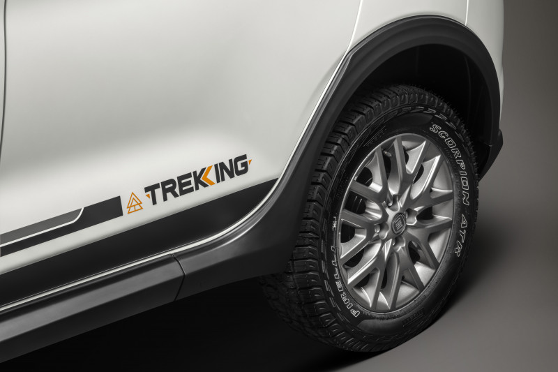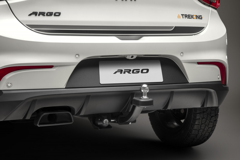 O Argo Trekking chega completo e cheio de estilo. O modelo é modelo é a única versão aventureira do segmento com teto, retrovisores e defletor de ar traseiro sempre pintado em preto. A versão tem ainda um adesivo preto no capô, faróis com guia de lanterna em LED (não é um DRL), nova moldura da caixa de rodas e do para-choque traseiro na parte inferior, logomarca da Fiat com acabamento exclusivo em cromo escurecido na traseira, ponteira de escapamento trapezoidal com cor exclusiva, além de rodas com aro 15 com calotas escurecidas. Opcionalmente, o cliente pode comprar como equipamento original, rodas em liga-leve.