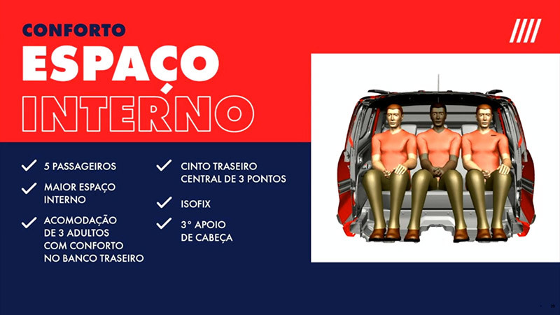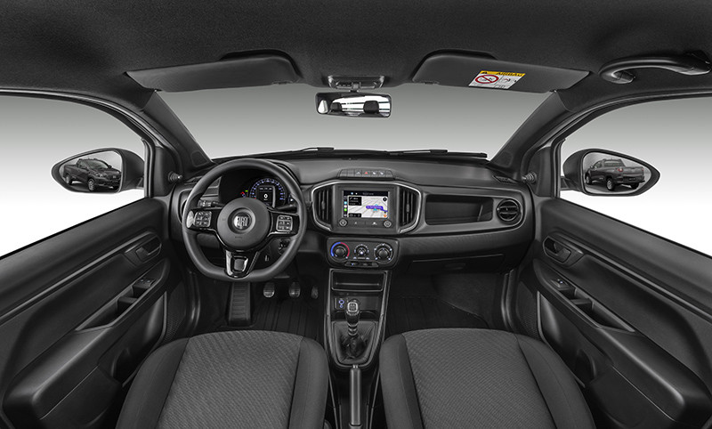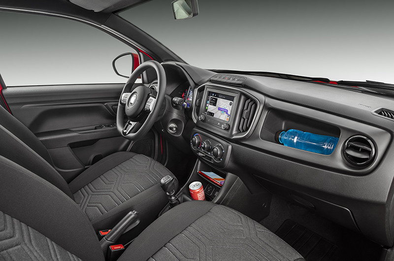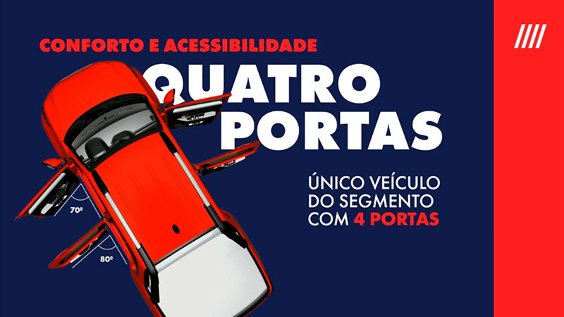 As portas dianteiras se abrem em 70º e as traseiras em 80º, facilitando o acesso a motorista e demais ocupantes. O passageiro do banco central também conta com cinto de três pontos e encosto de cabeça. Internamente, a cabine aumentou em 30% o número de porta-objetos, que agora somam 15 litros de espaço útil para os mais variados usos. São lugares especiais para celulares, garrafas, latas, carteiras e outros objetos pessoais, sempre à mão dos ocupantes.
