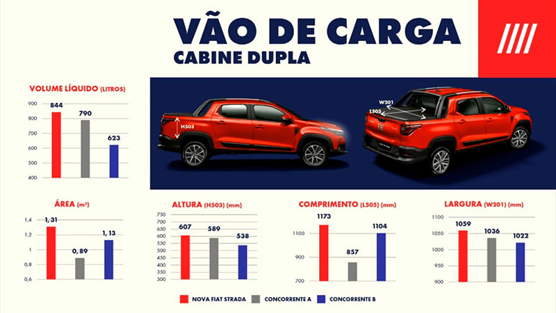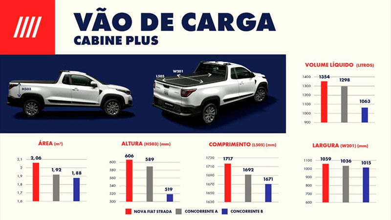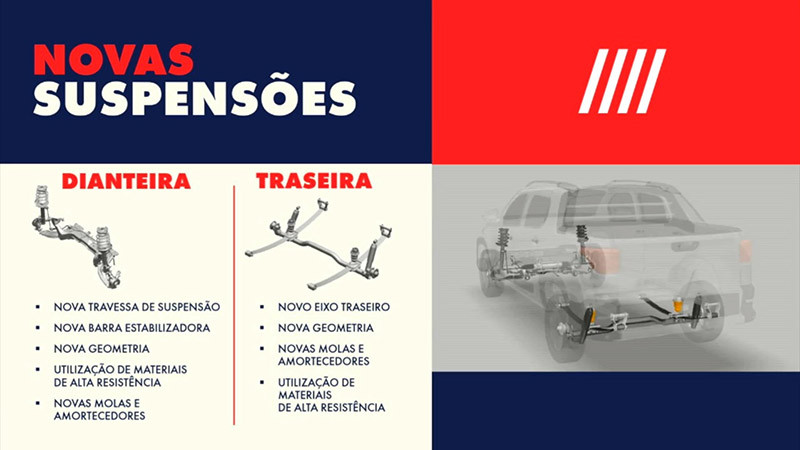 Além disso, o novo posicionamento da suspensão traseira permitiu maior vão de carga na caçamba entre as picapes da categoria: os 1.059 mm entre as torres no compartimento de carga facilitam muito a acomodação de grandes volumes em sua grande caçamba: são 844 litros na cabine dupla e nada menos que 1.354 litros na Cabine Plus. A capacidade de carga também vai além e varia de 650 kg na versão para cinco ocupantes para até 720 kg na configuração de entrada. Todos esses números demonstram a grande versatilidade e a desenvoltura ampliada da nova picape para qualquer situação de uso.
