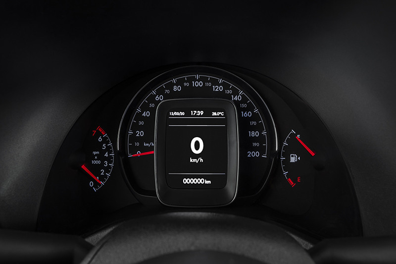 A tela é personalizável e exibe controle de todas as funções do veículo. Além disso, tem baixo reflexo diurno e brilho ajustável. O sistema dá suporte a múltiplas conexões via Bluetooth e conta com computador de bordo. Há ainda uma segunda porta USB à disposição dos passageiros.