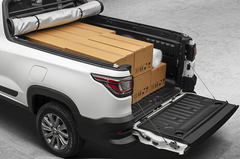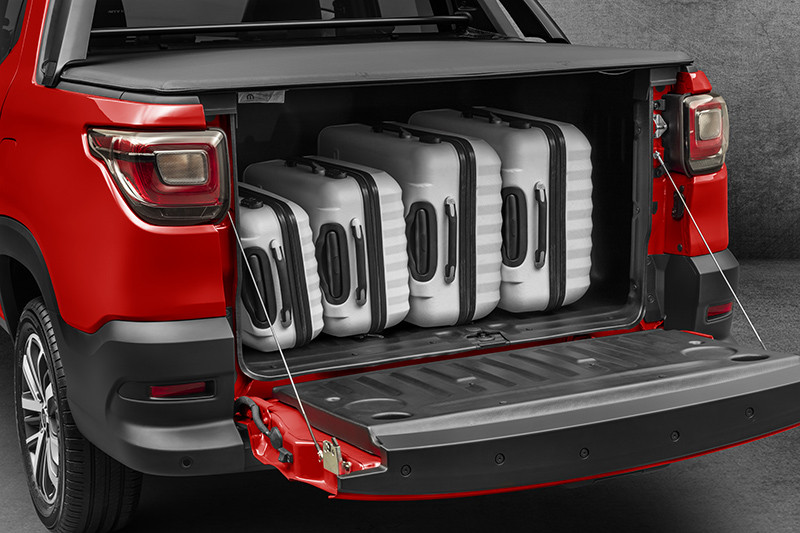 A movimentação de carga agora é facilitada pela tampa traseira, que teve seu peso de manuseio amortecido em 60% por um novo sistema de mola sem perder robustez, já que suporta cargas de até 400 kg. Para fechar a tampa, o esforço é mínimo. O vão de carga também é modular e recebeu trilhos para acessórios da Mopar, como divisórias e cargo box, além de contar com quatro ganchos inferiores e superiores, que tornam o espaço preparado para diferentes funções. Com o travamento da tampa, fica bloqueado também o acesso ao estepe, localizado abaixo do assoalho da caçamba para liberar mais espaço para carga.