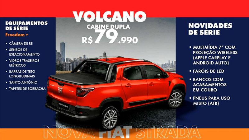 A Nova Strada Volcano conta também com vidros traseiros elétricos, bancos em couro/tecido, câmera de ré, volante em couro, faróis em LED e sensor de estacionamento. A versatilidade do modelo fica ainda mais evidente com itens como capota marítima, barras longitudinais no teto e de proteção (santantônio), além dos pneus 205/60 R15 ATR. Como opcional, o cliente pode optar por exclusivas rodas de liga leve de 16 polegadas (pneus 205/55 R16).