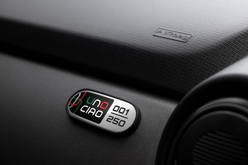 Todas as unidades são pintadas exclusivamente de Cinza Silverstone, com teto, retrovisores externos e spoiler traseiro pintados de preto. As portas têm maçanetas na cor do veículo e um adesivo lateral com o nome Uno Ciao acompanhado da frase “LA STORIA DI UNA LEGGENDA” — “a história de uma lenda” em italiano. O visual marcante é complementado por exclusivas rodas de liga leve escuras de 14 polegadas e o logo UNO nas cores da Itália à esquerda da tampa do porta-malas.