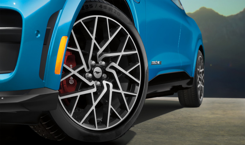 O sistema de tração integral eAWD do Mustang Mach-E é composto de dois motores elétricos, um em cada eixo, e transmissão automática com uma marcha à frente e outra à ré. Esse conjunto, com potência de 487 cv e torque de 87,7 kgfm – o maior da categoria –, acelera de 0 a 100 km/h em 3,7 segundos e atinge a velocidade máxima de 200 km/h, limitada eletronicamente.