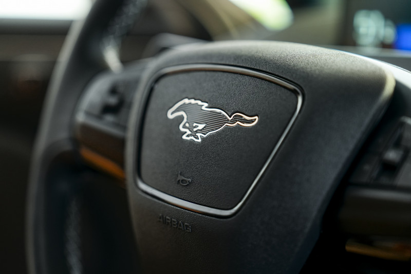 O seu design mantém os elementos clássicos do Mustang – nariz de tubarão, capô longo, coluna C rápida e lanternas de três barras – em formato de crossover. A cabine, com acabamento minimalista e requintado, traz teto solar, multimídia SYNC 4A com tela de 15,5”, painel de instrumentos de 10,2”, som B&O premium e carregador por indução. Os bancos dianteiros contam com ajuste elétrico, aquecimento e memória para o motorista. As portas, sem maçanetas, são abertas por um novo sistema de trava eletrônica, por botão, código ou celular, com o aplicativo FordPass.