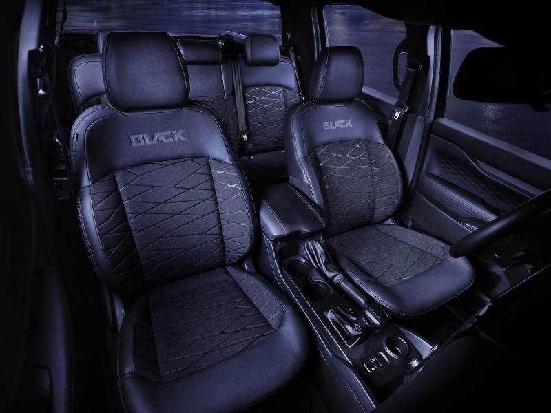 O interior da Ranger Black tem como base a cor preta, com detalhes em grafite e metal fumê. Além do teto preto da Ranger Raptor, ela conta com vários itens de acabamento da versão de topo XLT, incluindo o volante revestido em couro, a moldura da central multimídia e saídas de ar em Black Piano.