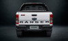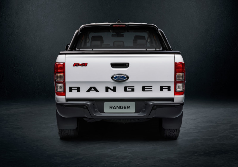 A traseira exibe um distintivo vermelho FX4 em alto relevo e o nome Ranger em letras grandes totalmente em preto – outra característica única na linha. As lanternas têm máscara escurecida. O para-choque traseiro, assim como os retrovisores e maçanetas, são em preto brilhante.