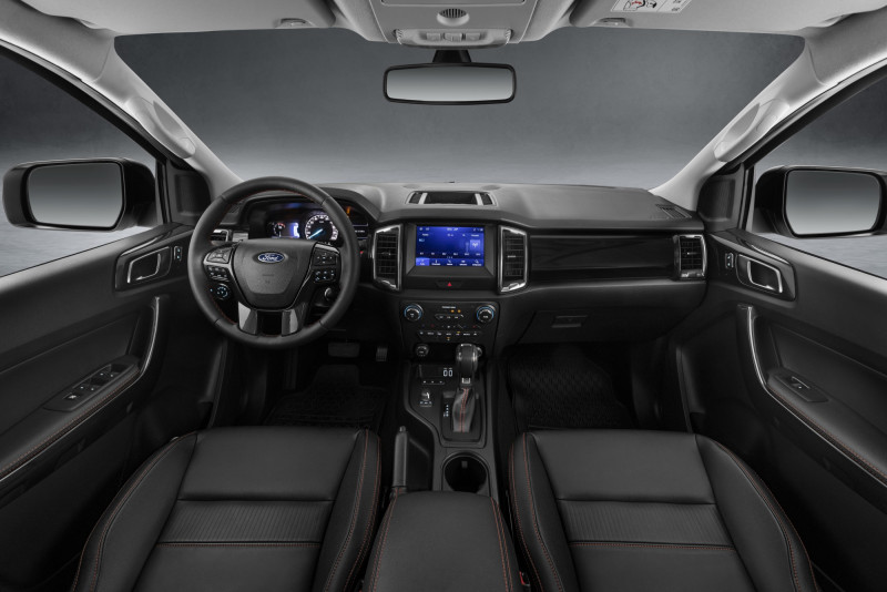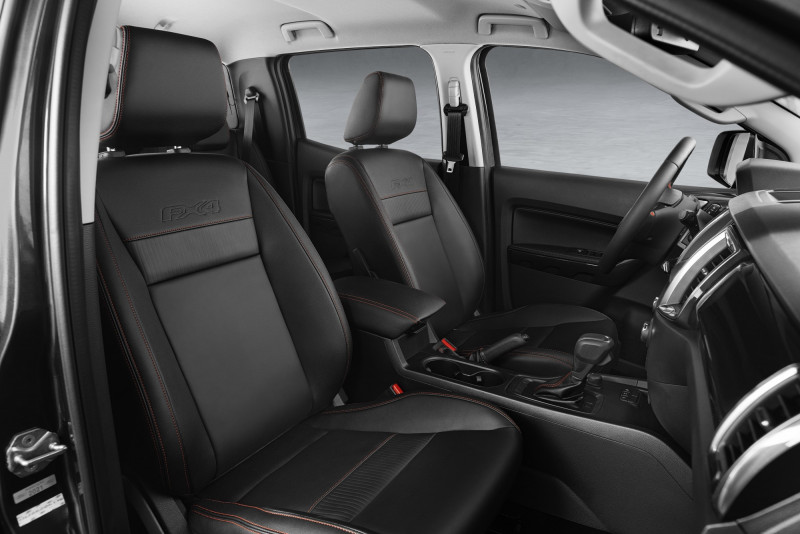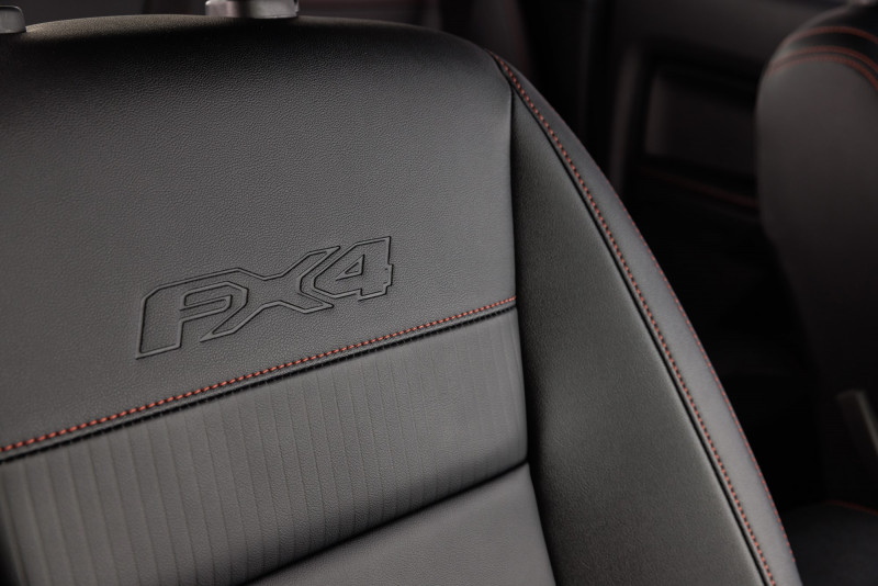 O interior da nova picape é igualmente requintado e exclusivo, incluindo bancos de couro premium com costuras vermelhas e o emblema FX4 em relevo nos encostos. O mesmo acabamento é visto na alavanca do câmbio e no descansa-braço central. Outro detalhe que chama a atenção é o aplique com acabamento escuro brilhante no painel em frente ao passageiro, no volante e nas molduras das maçanetas internas.